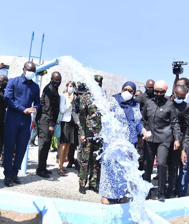 Rais wa Jamhuri ya Muungano wa Tanzania, Mhe. Samia Suluhu Hassan akifungulia maji kama ishara ya uzinduzi wa mradi wa Maji utakaohudumia Mji wa Misungwi na maeneo ya pembezoni leo tarehe 14 Juni, 2021.