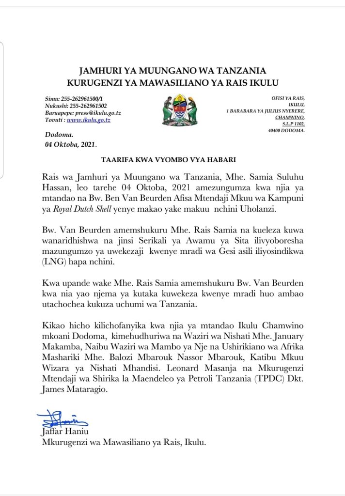 Wakati wa mazunguzmo hayo ambayo Rais Samia Suluhu Hassan ameyafanya akiwa Ikulu Chamwino mkoani Dodoma, Van Beurden ameeleza kuridhishwa na jinsi Serikali ilivyoboresha mazungumzo ya uwekezaji kwenye mradi huo wa gesi asili iliyosindikwa hapa nchini.