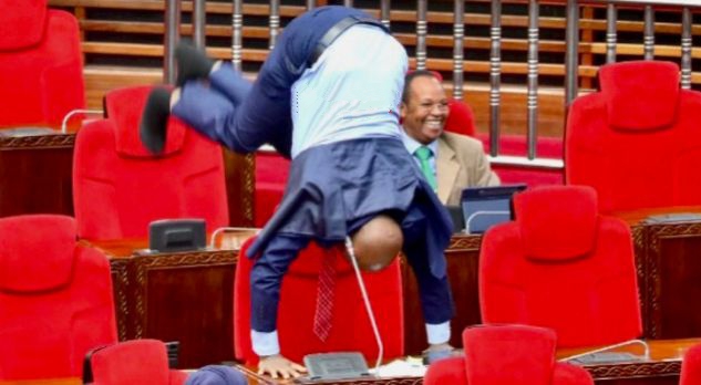 Baadhi ya wabunge walimwambia aruke sarakasi, hali iliyomfanya mbunge huyo kubinuka sarakasi akitumia meza yake.